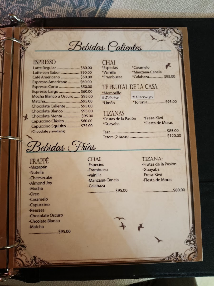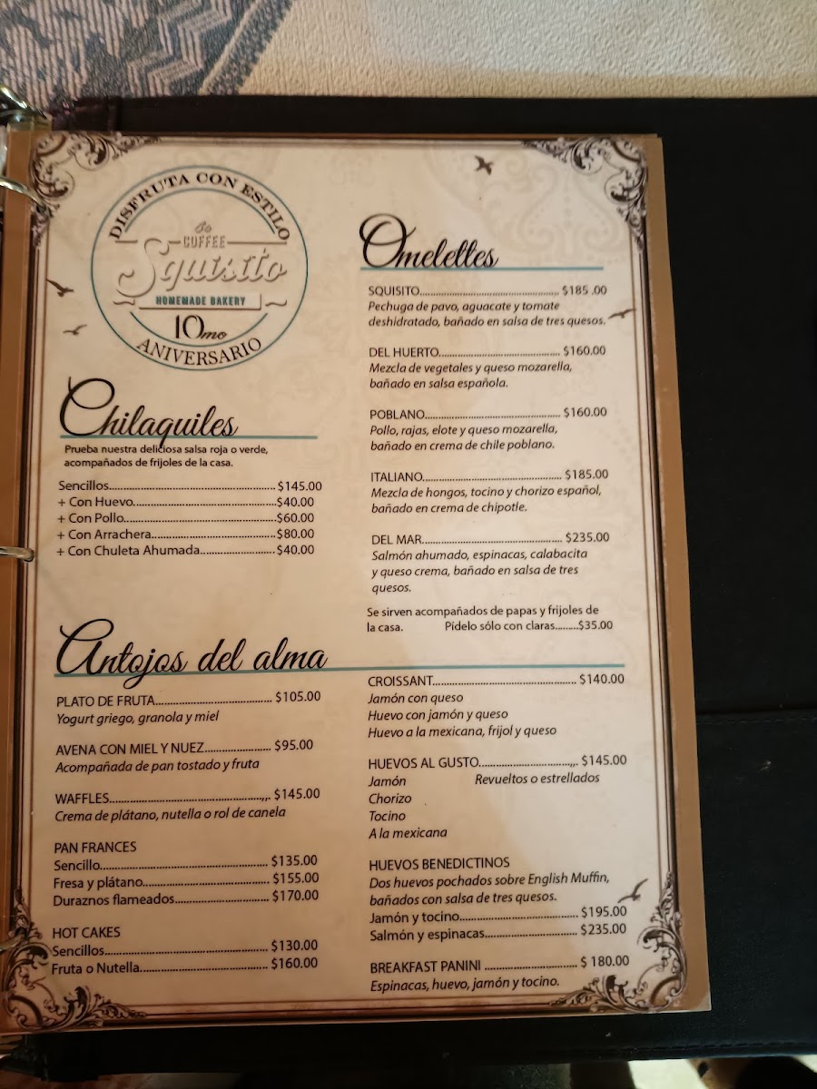 The drink menu boasts an impressive array of coffee options, from classic brews to sophisticated lattes, with prices starting at just MX$50. Special favorites like the Mocha Squisito blend rich flavors for an indulgent treat.